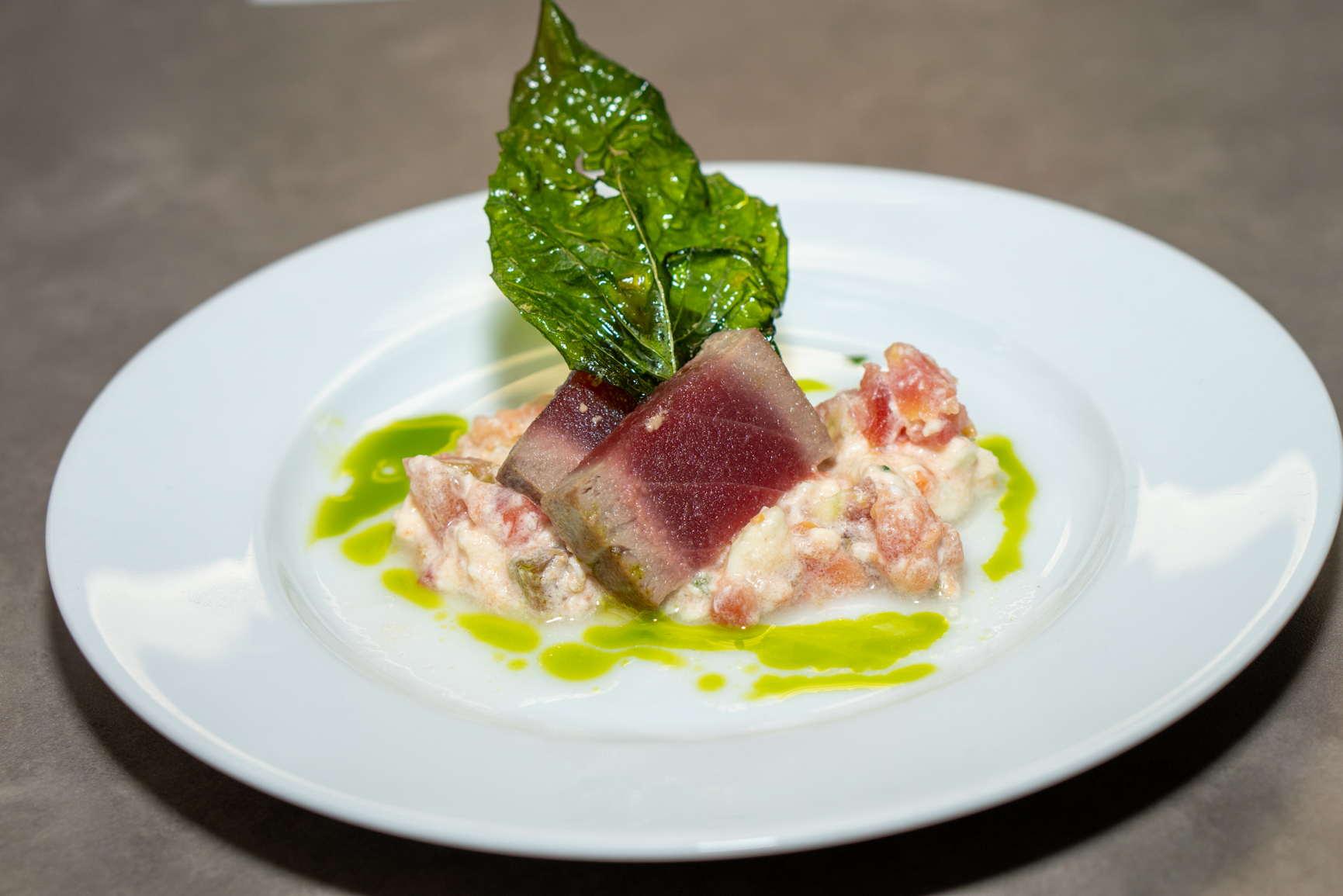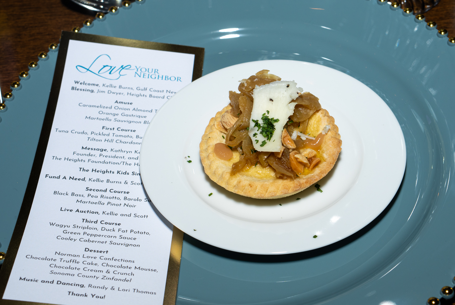 The five-course dinner was artfully created by Harold Balink of Harold’s Restaurant and featured a beautifully curated progression of flavors. Guests began with a caramelized onion almond tart amuse paired with Sauvignon Blanc, followed by a vibrant first course of tuna crudo with pickled tomato, burrata, and basil oil.